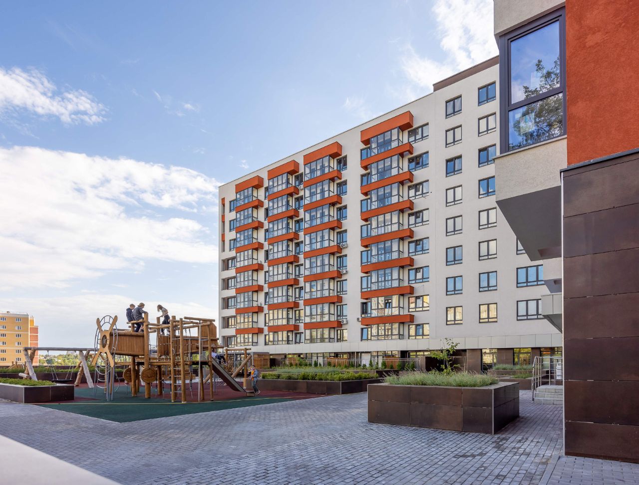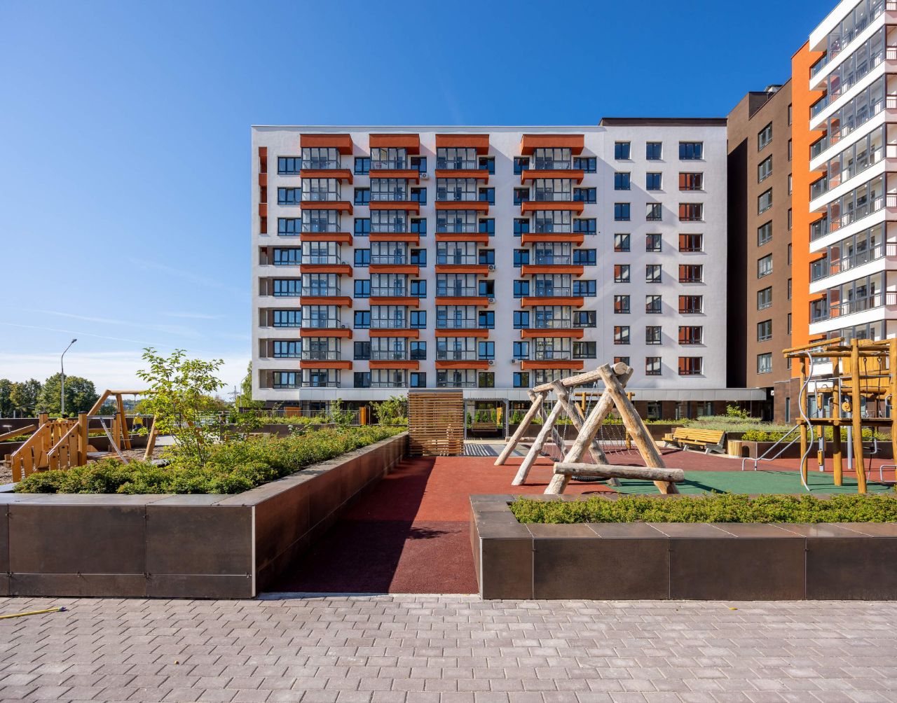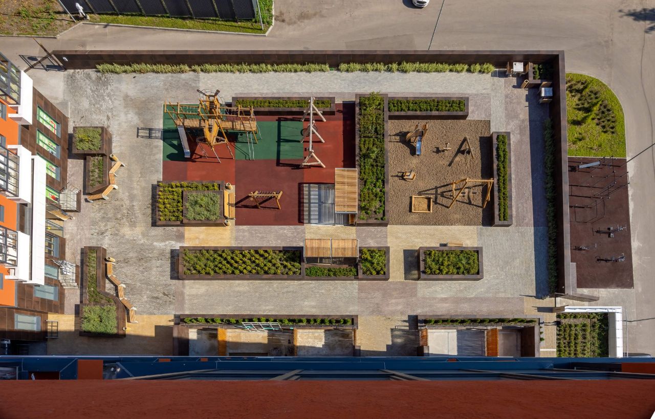 Две детские площадки точно займут место среди лучших воспоминаний детства у вашего ребёнка: современные карусели, качели и различные игровые комплексы займут большую часть придомовой территории.