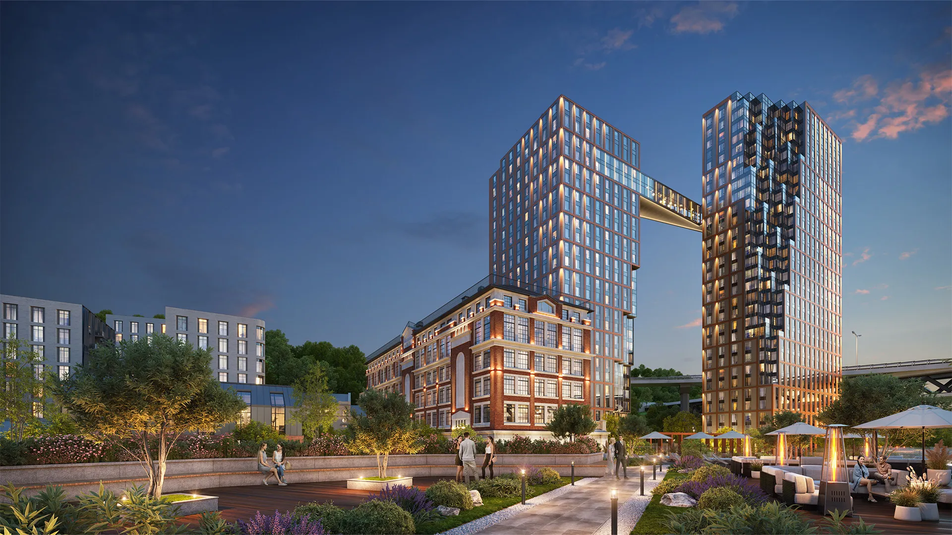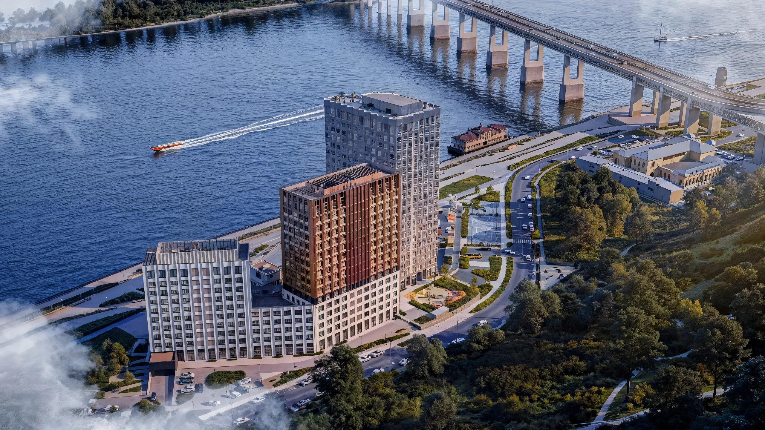 - Парящий мост: Две башни комплекса соединит парящий мост с панорамным видом на Оку.